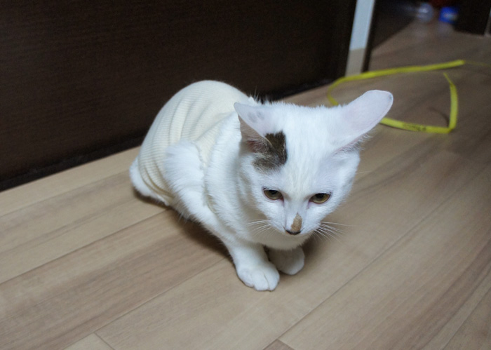 傷口を舐めないように服を着ています。